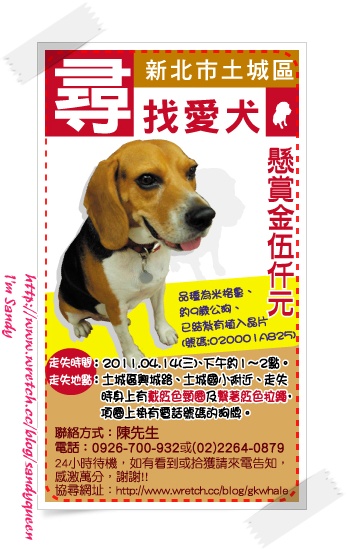 走失時間:2011/4/14下午1~2點左右Sandy 發表在 痞客邦 留言(9) 人氣(6)